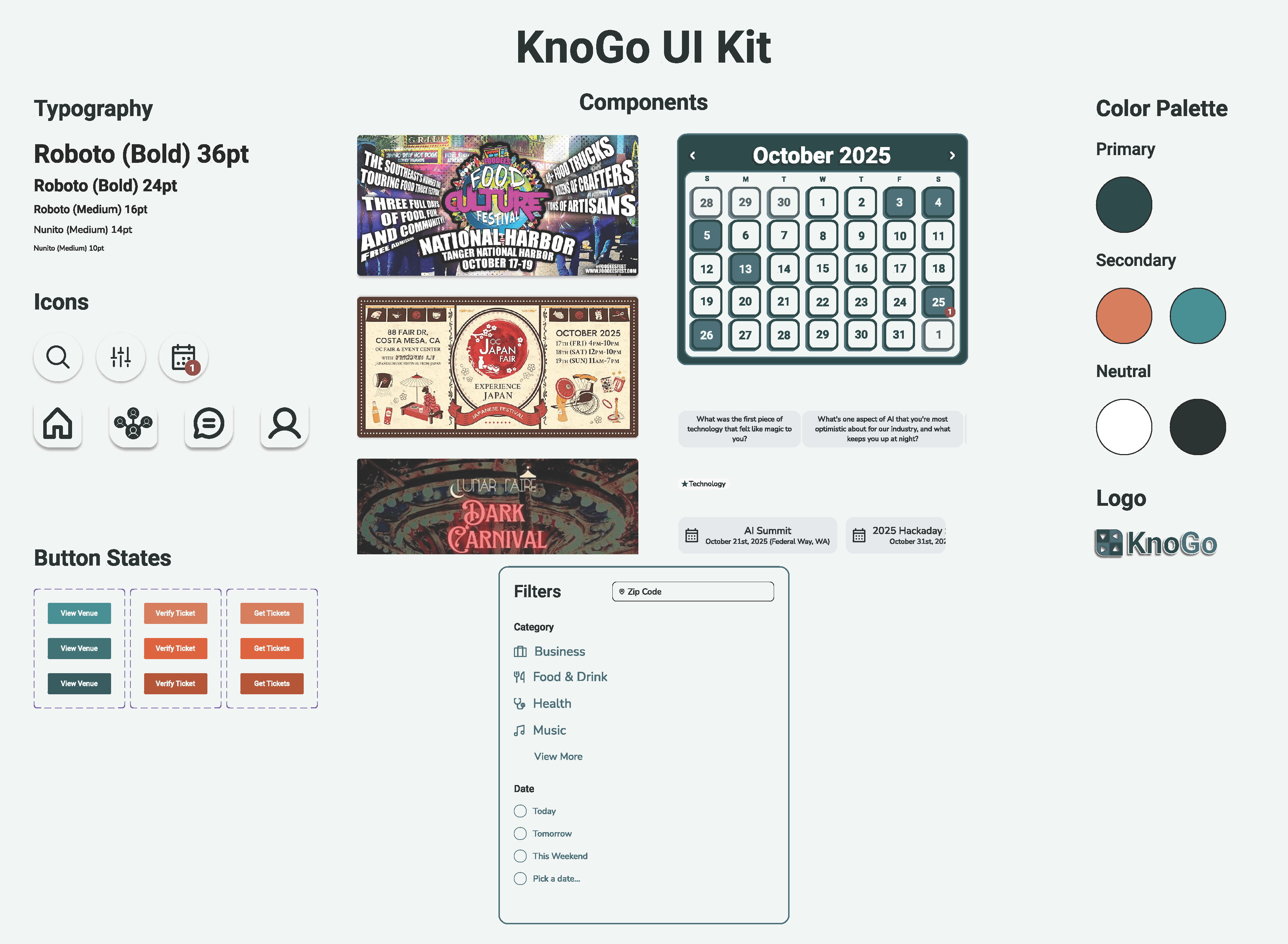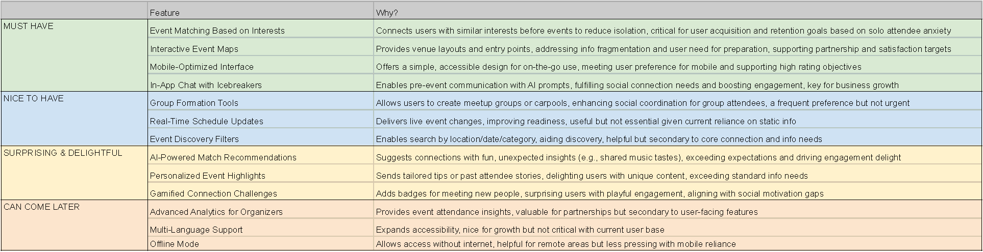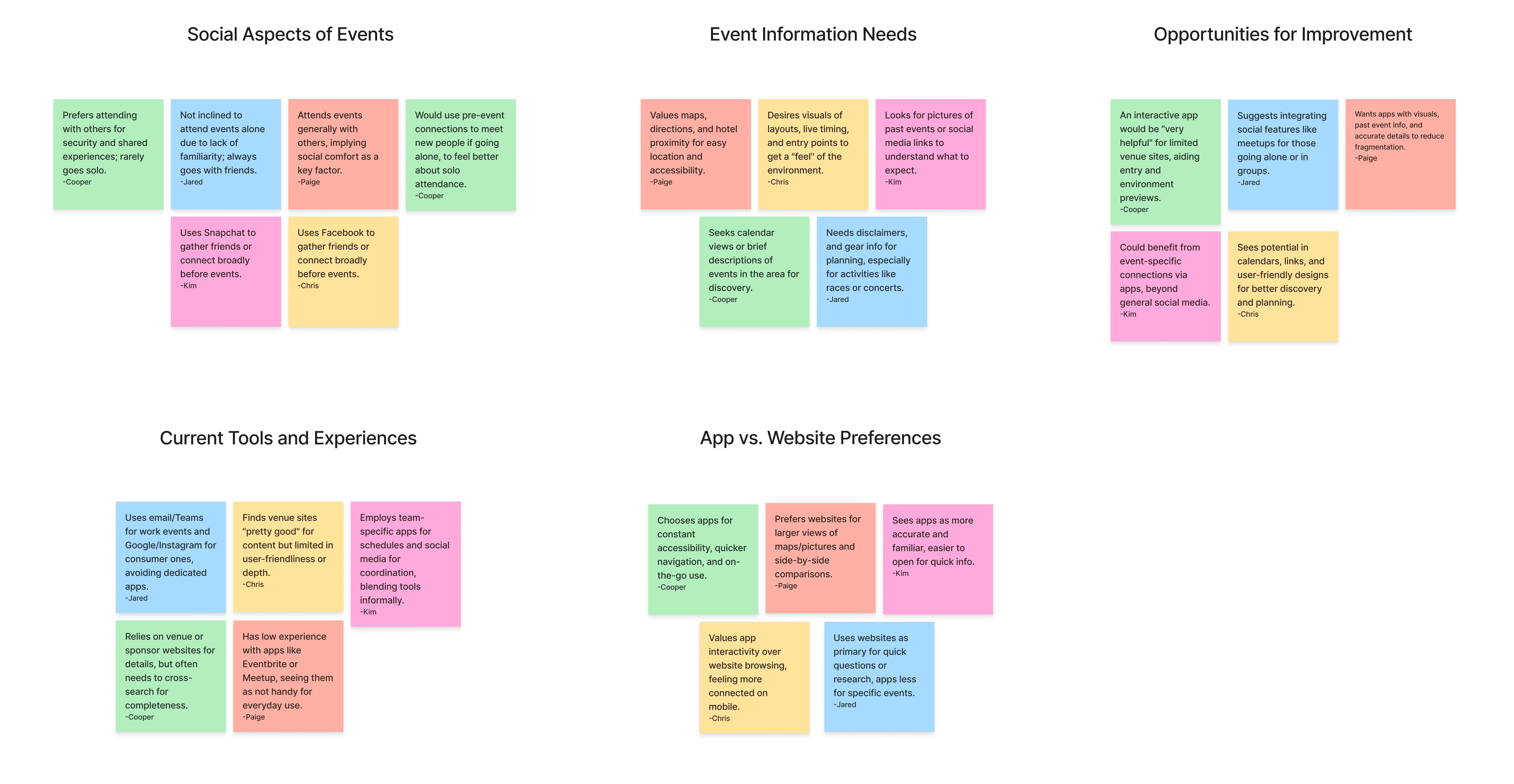 I grouped user insights from Cooper, Jared, Paige, Kim, and Chris into themes of social comfort, information fragmentation, and tool preferences. These insights revealed clear gaps, KnoGo’s current event discovery risks solo hesitation and planning friction from scattered venue sites and social media, while lacking the visual previews, mobile interactivity, and pre-event connections that build confidence on platforms like Eventbrite or Instagram.