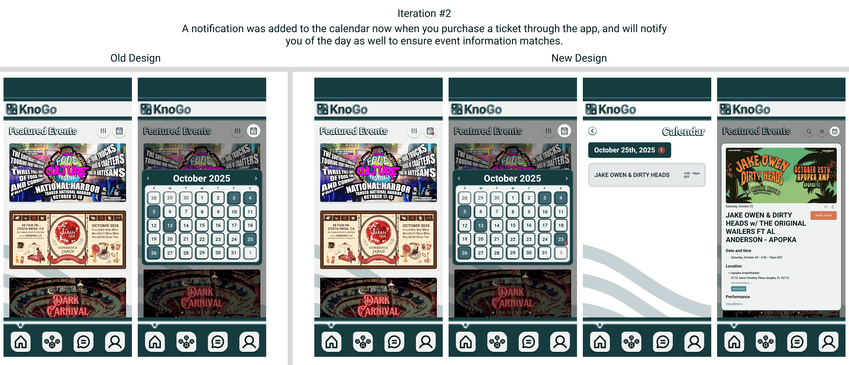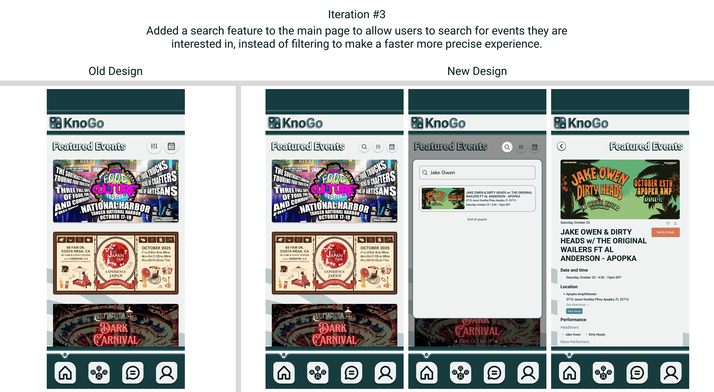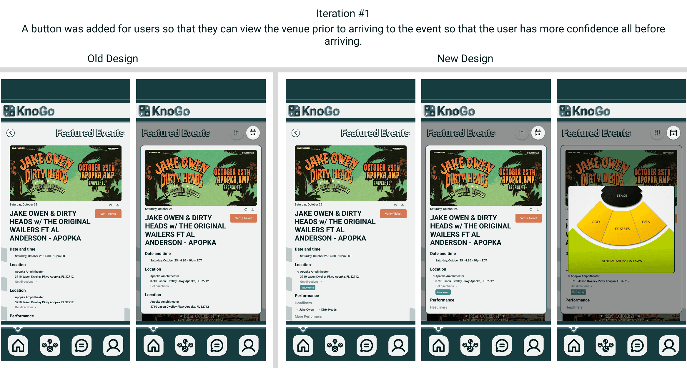 I grouped user insights from Cooper, Jared, Paige, Kim, and Chris into themes of social comfort, information fragmentation, and tool preferences. These insights revealed clear gaps, KnoGo’s current event discovery risks solo hesitation and planning friction from scattered venue sites and social media, while lacking the visual previews, mobile interactivity, and pre-event connections that build confidence on platforms like Eventbrite or Instagram.