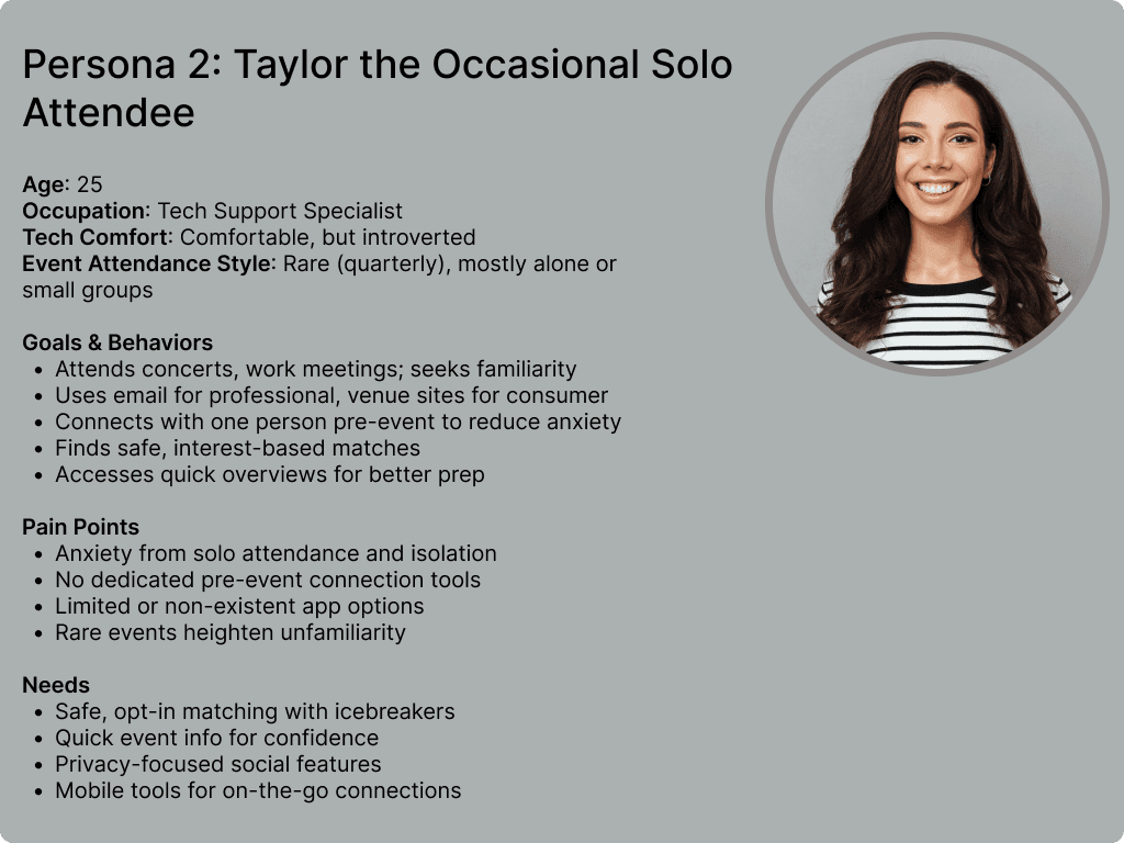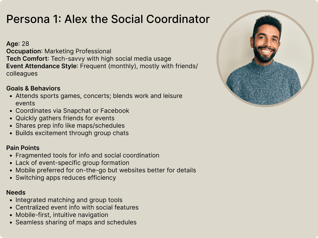KnoGo users, from social coordinators like Alex to occasional solo attendees like Taylor, struggle with fragmented coordination, solo-anxiety, and tool-switching, as event info scatters across venue sites, emails, and social apps, while lacking integrated group formation, safe pre-event matching, or mobile-first sharing. Event planning adds value for excitement and connection but feels inefficient and isolating without centralized details, visual prep (maps/layouts), or privacy-focused social tools. Key needs include integrated matching and group chats, quick event overviews with schedules, seamless mobile navigation, and opt-in icebreakers to boost confidence, attendance, and engagement across frequent and rare event-goers.