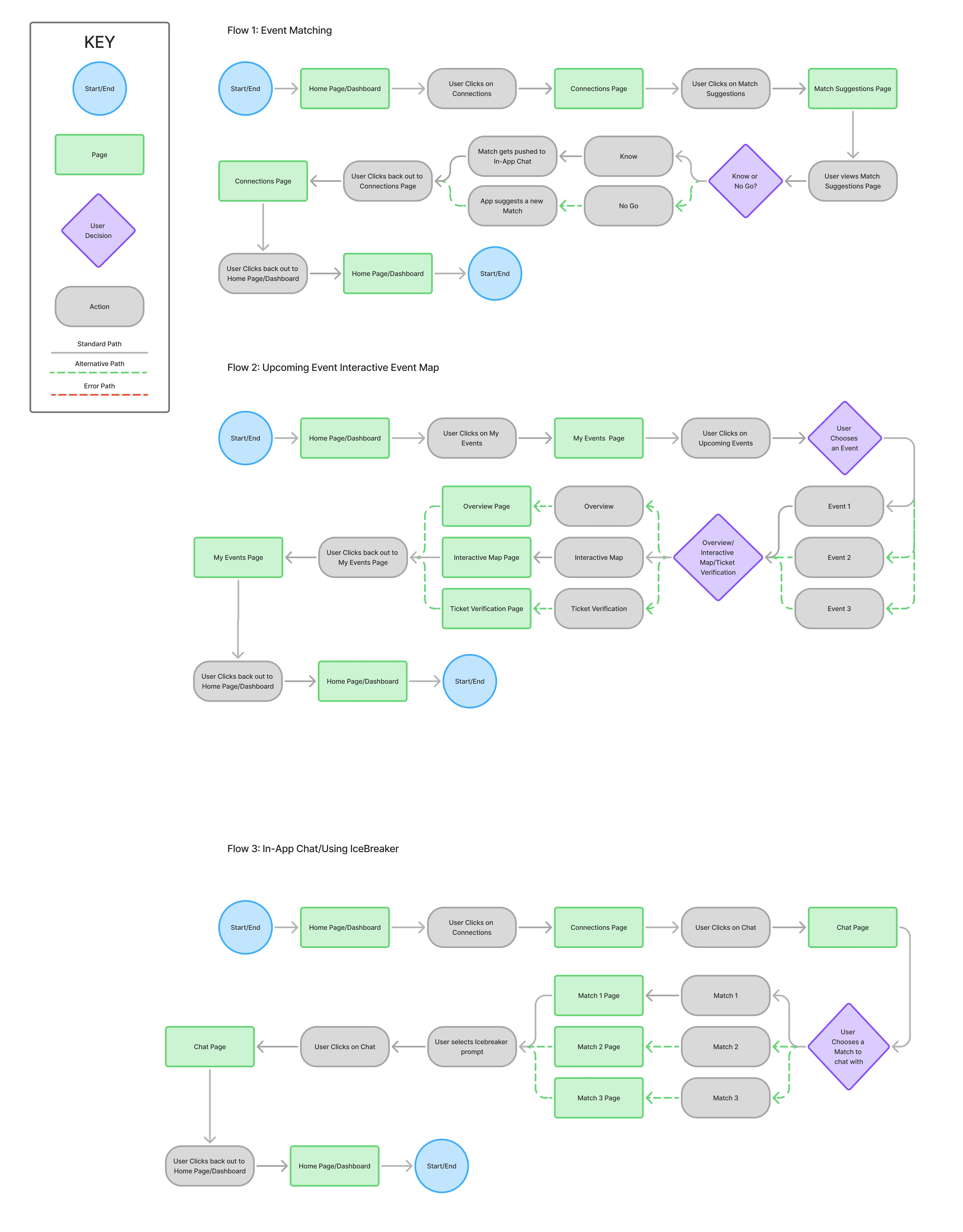 The proposed KnoGo user flows enable seamless event connection and planning by opening the app, accessing the Home Page/Dashboard, and branching into three core paths: