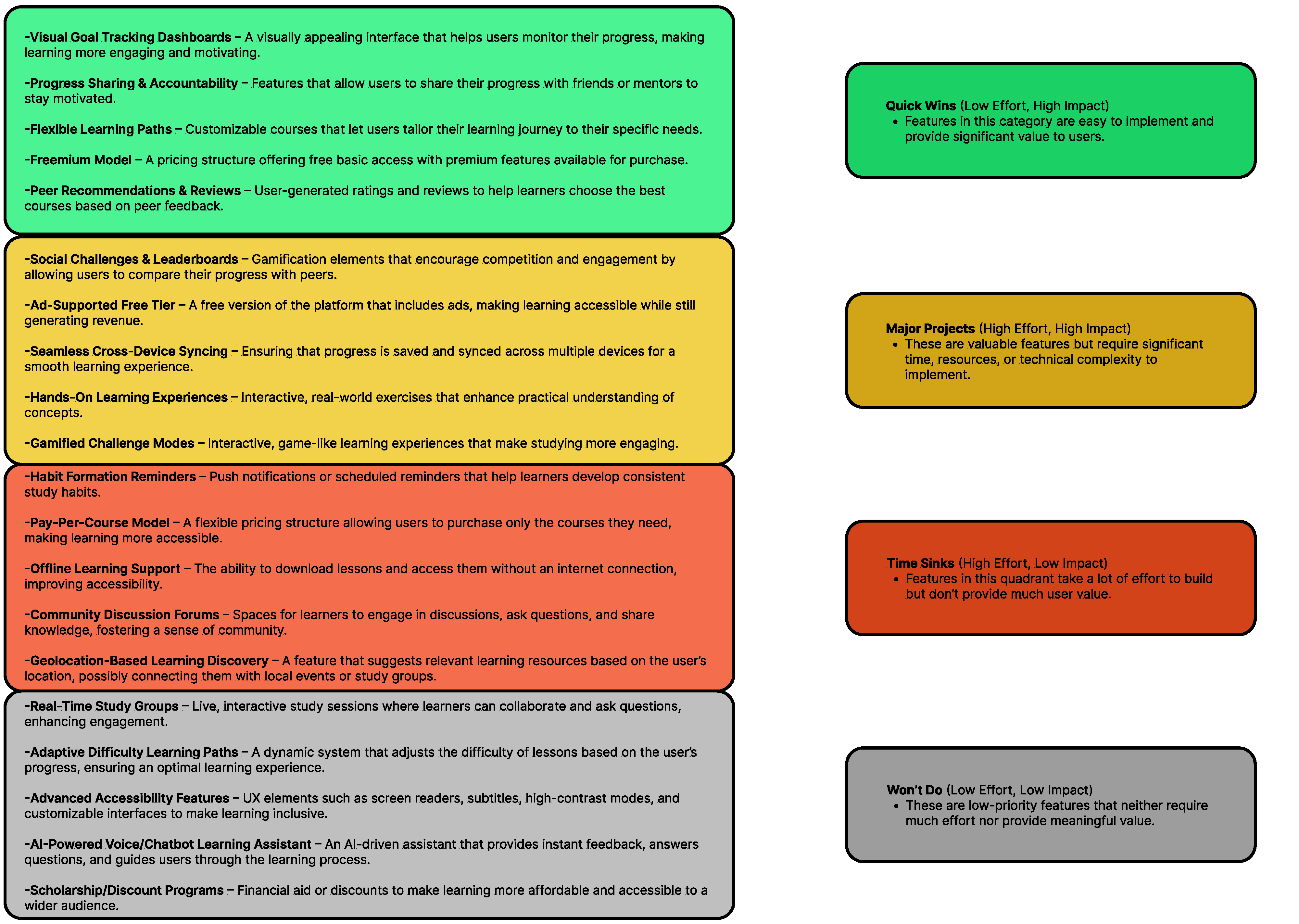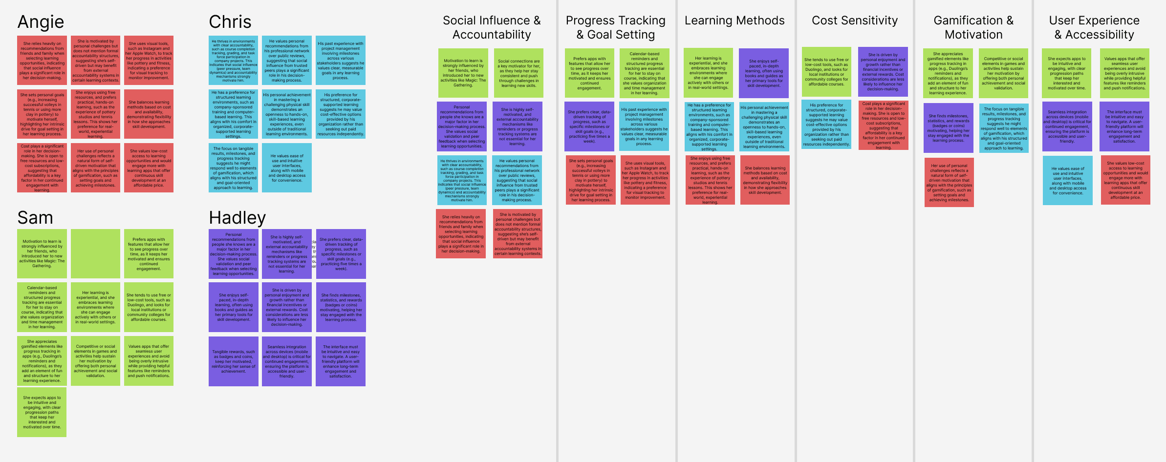 I grouped user insights from Angie, Chris, Hadley, and Sam into themes of social influence, progress tracking, experiential learning, cost sensitivity, and gamified motivation. These insights revealed clear gaps, Learny’s current skill-building experience risks disengagement from fragmented tools and missing accountability, while lacking the intuitive progress dashboards, social validation, and low-cost gamification that sustain learners on platforms like Duolingo or corporate training apps.
