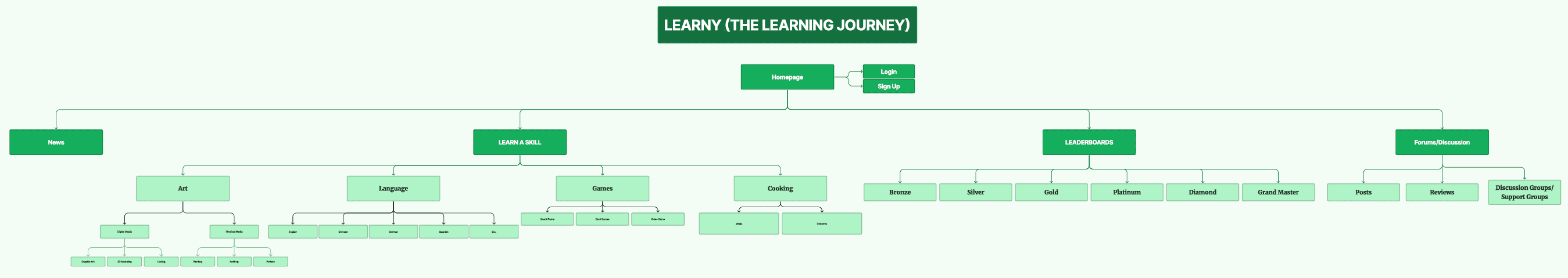 The proposed Learny user flows enable seamless onboarding, skill exploration, and tiered access by opening the app, accessing the Dashboard, and branching into three core paths: