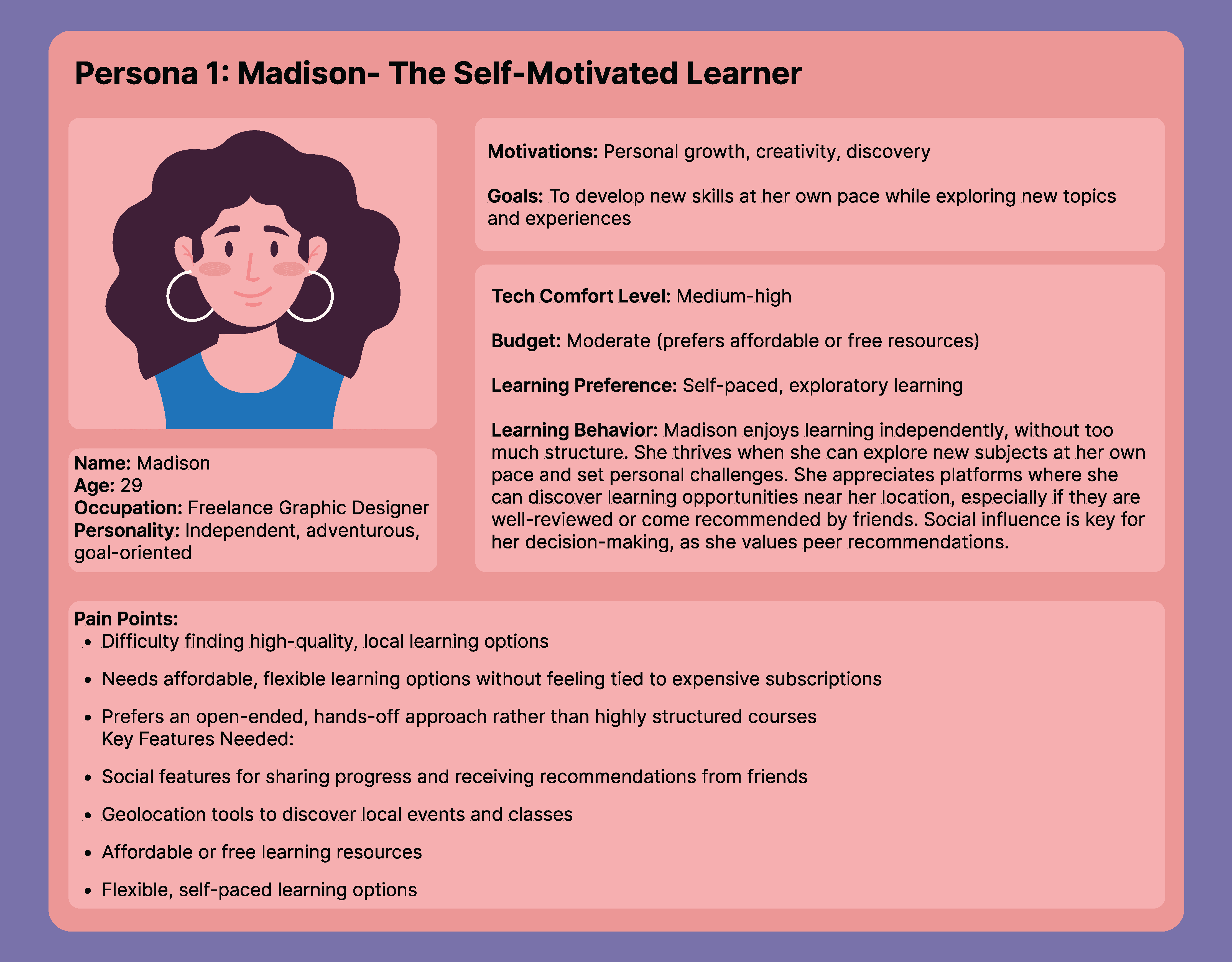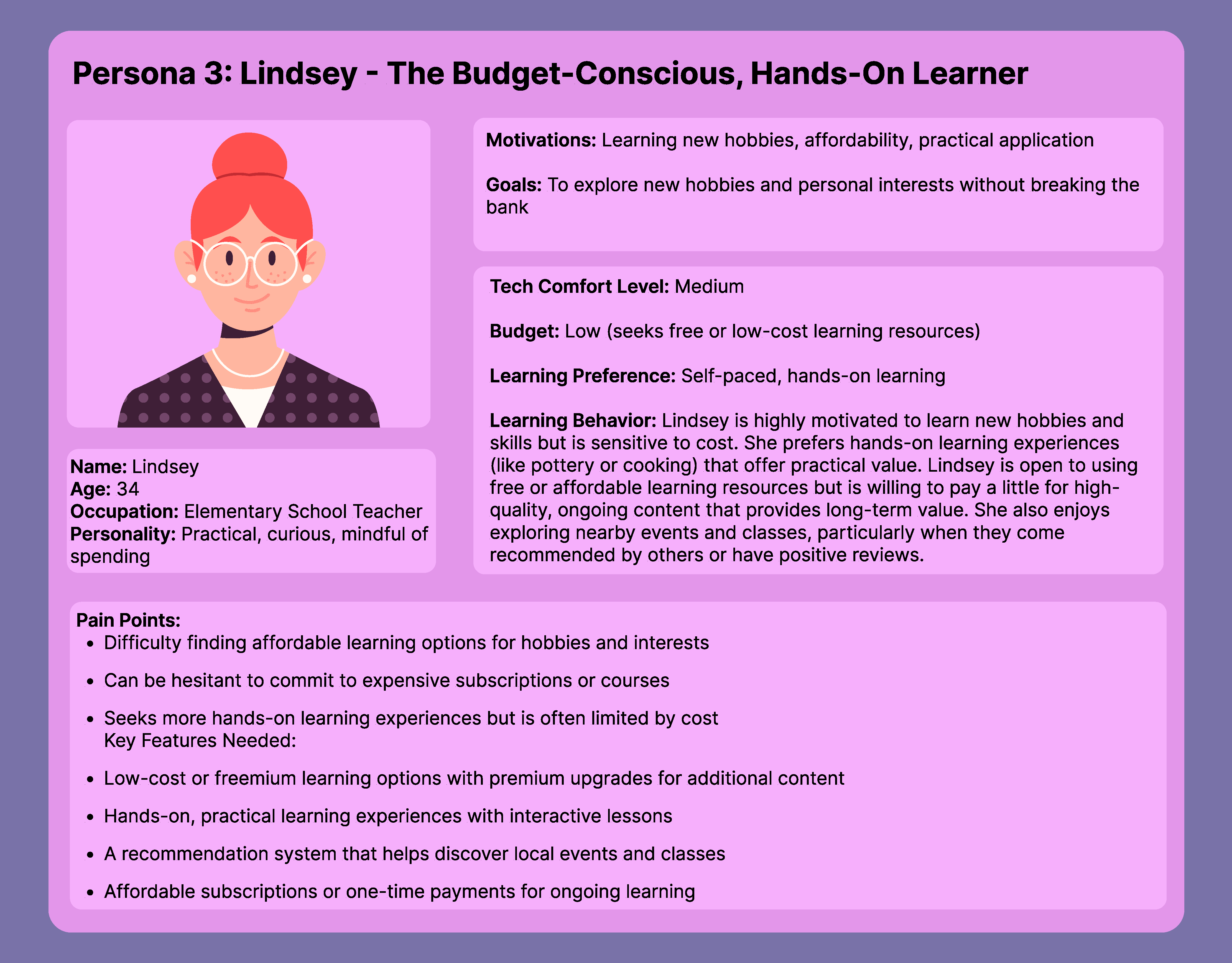 Learny users, from self-motivated explorers like Madison to budget-conscious hobbyists like Lindsey, struggle with discovery friction, cost barriers, and fragmented options, as quality local classes hide behind paywalls, expensive subscriptions deter commitment, and hands-on experiences remain hard to find affordably. Learning adds value for personal growth and practical skills but feels inaccessible without peer-validated recommendations, flexible pricing, or geolocated discovery. Key needs include social progress sharing with friend recommendations, low-cost/freemium access with premium upgrades, geolocation for nearby events and classes, and self-paced, interactive lessons to drive engagement, retention, and real-world application across independent and cost-sensitive learners.